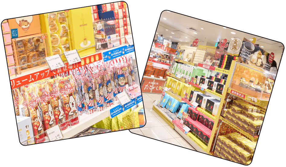 오사카의 명물이나 게이한신 지역의 기념품이 꽉 찬 장소에서, 돌아가는 길에 조금 들러 추억에 남는 아이템을 겟합시다!